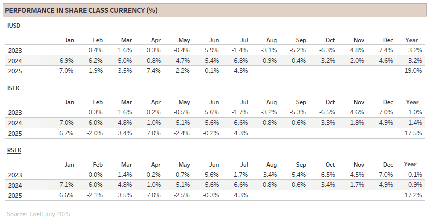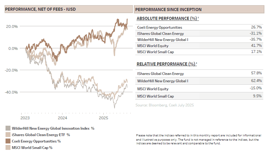 The Coeli Energy Opportunities fund gained 4.3% net of fees and expenses in July (I USD share class). Year-to-date, the fund is up 19.0% and it has gained 26.7% since inception in February 2023.