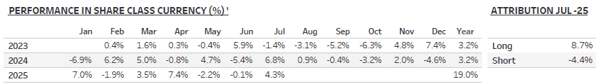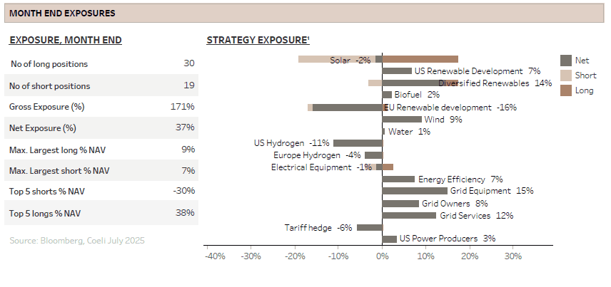 July was a volatile month for the fund. Long positions did well, contributing 8.7% to NAV, driven in part by “powering AI” themes like ‘Grid Equipment’ and ‘Grid Services’, combined adding 2.9% to the monthly performance. There are no indications yet that hyperscalers will reduce their capital expenditure on AI chips, infrastructure, or power. On the contrary, AI momentum appears to be strengthening, with META and Microsoft (MSFT) reporting rising revenues and returns from their AI businesses. Spending on AI and its expected returns remains one of the most important drivers for the stock market, outweighing concerns about a potential tariff-induced slowdown.