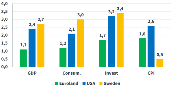 Fastigheter är en lokal industri som i hög utsträckning styrs av den lokala ekonomins utveckling. Studier visar att BNP- och sysselsättningsutveckling är den viktigaste faktorn som styr  totalavkastningen från investeringsklassen fastigheter. Diagrammet nedan visar att svensk ekonomi ser ut att utvecklas väl igen. Tillväxten i BNP, konsumtion och investeringar är bra i absoluta tal och överstiger tydligt talen från USA och övriga Europa. Reala löneökningar på över 3%, förväntas bidra till bra konsumtionstillväxt. Den starka makroekonomiska utvecklingen kommer med stor sannolikhet leda till ökad sysselsättning vilket i sin tur driver på efterfrågan på olika typer av lokaler. Framtiden ser ljus ut!