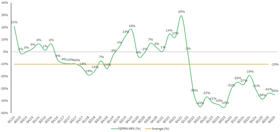 Till skillnad från S&P 500 och Nordens gemensamma börsindex Nasdaq OMX Nordic 120 - som båda ligger nära historiska toppar - så ligger Nordens fastighetaktieindex[3] fortfarande på en nivå som motsvarar ca 60% av toppnivån i slutet av 2021. Dagens värdering är låg ur ett historiskt perspektiv. Den genomsnittliga rabatten vs underliggande substansvärde är ca 35%. Det innebär att aktieindexet kan stiga med 25% och ändå bara komma upp till en värderingsnivå om ca 20% rabatt, vilket fortfarande skulle understiga det långsiktiga genomsnittet på ca 10% rabatt. Se graf nedan.