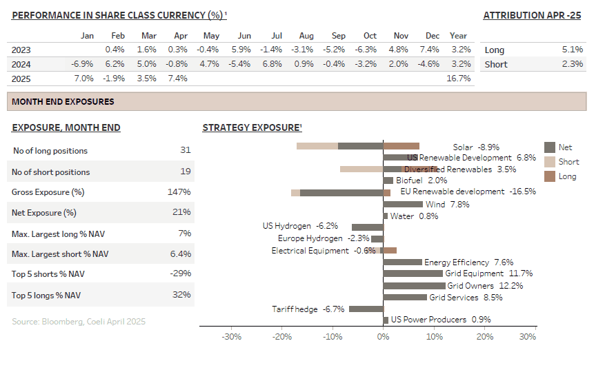 April largely continued the strong performance seen in March, driven by effective stock picking and active trading capitalizing on the high volatility. We maintained our negative exposure to tariffs while increasing positions in stocks benefitting from higher fiscal spending in Europe. Although we reduced our net exposure to the AI power thematic, we retained enough to benefit as AI momentum returned at the end of the month. We are also pleased that the fund generated positive P&L not only during the rally in the second half of the month, but also during the initial sell-off following ‘Liberation Day’.