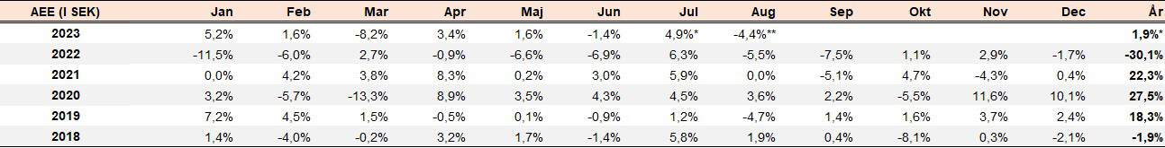 ** Inkluderar 1 september (strategiomläggning till long-only: 4 september 2023)