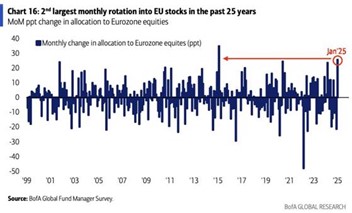 2025 rivstartade med börsoptimism och omfattande nyhetsflöde om makro, politik och kinesiska teknologiframgångar. Trots ett uttalat mycket lågt intresse för Europa utifrån ett globalt investeringsperspektiv, var det just Europa som tog ledningen med betydande uppgångar i framför allt de breda aktieindexen. Eurostoxx 50 till exempel steg i januari med 8 procent jämfört med S&P500 som steg 2,6 procent. Tyska DAX, som stigit 19 respektive 20 procent 2023 och 2024, steg ytterligare i januari med hela 9 procent och var därmed en av världens bästa aktiemarknader. Som påpekats många gånger tidigare, aktiemarknaden speglar inte den underliggande ekonomin.
