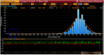 Världens viktigaste aktie, Nvidia, sjönk på måndagen den 27 januari med 18 procent vilket i värde motsvarade hela Sveriges BNP. Nedan en bild som visar Goldman Sachs ”Power Index Basket” som den dagen sjönk med hela 13,5 procent. Bilden visar fördelningen av daglig avkastning de senaste två åren och längst till vänster kan ni skymta 27 januari. När månaden var slut stängde korgen ändå upp med 7,7 procent.