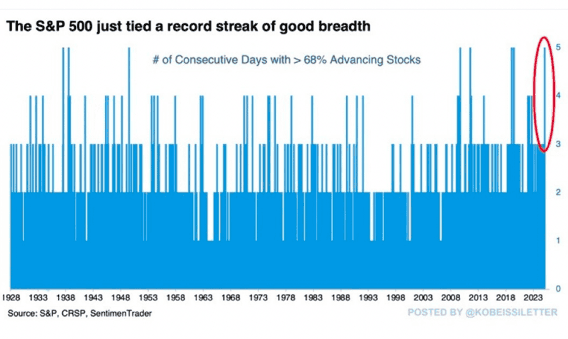 Nedanstående bild visar historik över bredden i marknaden sedan 1928. Fem dagar i sträck steg mer än 68 procent av aktierna i indexet vilket endast har hänt ett fåtal av gånger den senaste 97 åren.