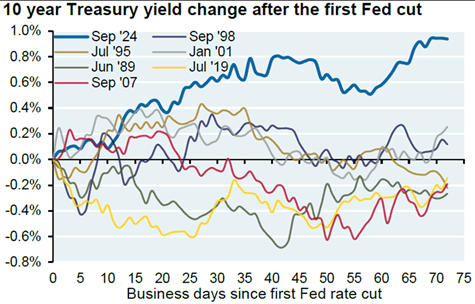 Det är bilden nedan som gör Trump synnerligen upprörd. Trots räntesänkningar sedan september förra året fortsätter den amerikanska 10-årsräntan att stiga. Ett tips till administrationen är att leta efter svaret på varför det är så. En ytterligare och ödmjuk kommentar är att tullar sannolikt inte kommer få räntan att sjunka.