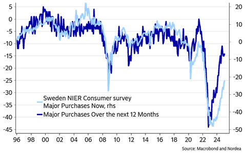 På temat räntesänkningar vänder det nu på allvar i Sverige vilket syntes i data som presenterades under januari. Det var genomgående starka siffror för svensk ekonomi. Exportorderingången vänder upp, detaljhandeln växte fyra procent i december och hushållen är inte längre oroade över arbetsmarknaden, inklusive den hårt sargade byggsektorn.