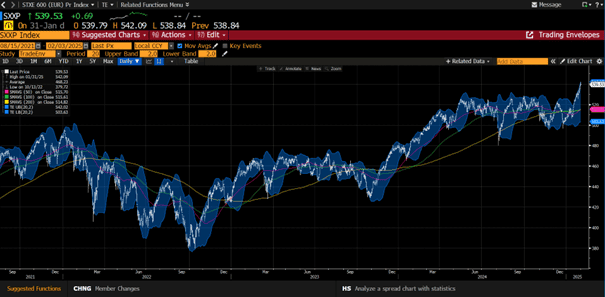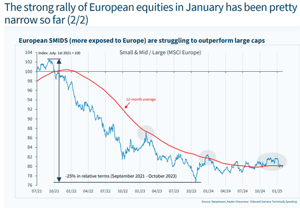 Trots många utmaningar har den europeiska aktiemarknaden (Stoxx 600) under årets inledning tydligt brutit ut från ett gammalt handelsmönster, se bilden nedan. Som vi nämnde förra månaden, när förväntningarna är så nedpressade samtidigt som värderingarna är historiskt låga brukar det bli så här. Det återstår att se hur kommande månader blir med en hetsig amerikansk administration som efter att ha varit igång drygt 10 dagar nu slåss på flera fronter mot resten av världen i ett just igångsatt och annalkande handelskrig.