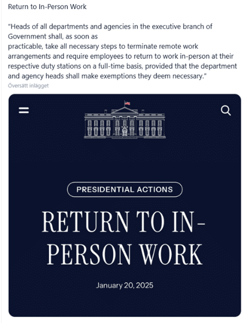 Donald Trump är sedan den 20e januari USAs 47e president och man måste imponeras över hastigheten han arbetar i. Det var intressant att se hur många företagsledare som var med i rotundan, under kupolen på Capitolium, när han lade handen på bibeln och svor presidenteden. Samma dag kom nya instruktioner till samtliga anställda inom departementen att sluta arbeta hemifrån. Ingen mer yoga på arbetstid är slutsatsen.