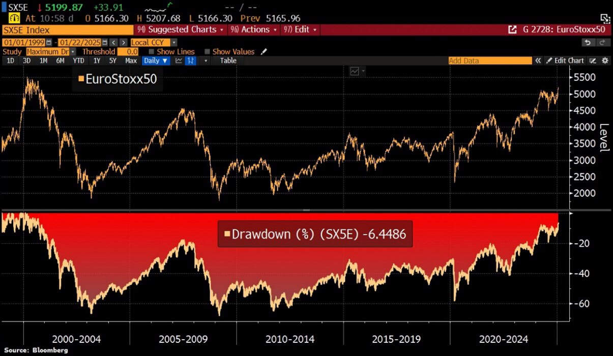 För att sätta ovanstående bild i ett längre perspektiv, trots betydande uppgångar de senaste åren så har Euro Stoxx 50 ännu inte nått högstanivån från år 2000 vilket säger en hel (det har dock Stoxx 600 gjort).
