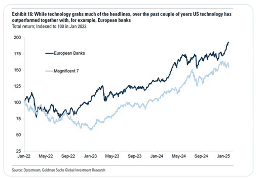 Europeiska banker upplever sedan några år de bästa förutsättningarna på flera årtionden och är också den sektor i Europa som haft starkast kursutveckling fyra år i sträck. De tre senaste åren har de utvecklats starkare än Mag7 i USA. Fonden ägde Commerzbank från november 2022 till i höstas då vi (felaktigt) tog hem vinsten. Sedan årets inledning är vi istället ägare i den österrikiska banken Bawag.