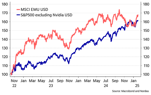 En uppdaterad bild från förra månadsbrevet. S&P500 minus Nvidia (”S&P499”) jämfört med ett brett europaindex mätt i samma valuta sedan marknaden vände upp i november 2022. Den här bilden säger väldigt mycket. Narrativet om den europeiska aktiemarknaden jämfört med den amerikanska haltar trots allt en del. Passivt kapitals positionering har nog inte tänkt på nedanstående bild (vår gissning) och samtidigt har DeepSeek dykt upp vilket ändrar en hel del förutsättningar.