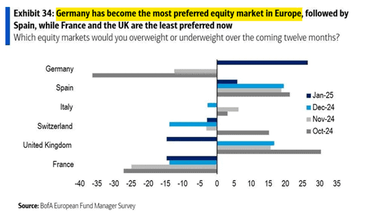 Tysklands aktiemarknad är glödhet! Nedanstående bild förklarar en del varför DAX fick en så bra start på börsåret. Notera också Spanien som populär investeringsmarknad och som land utklassar resten av Europa med cirka tre procent i BNP-tillväxt 2024. Frankrike i botten. Kan det ha att göra med högst mediokra politiker som till exempel föreslår en skatt på återköp av aktier. Man tar sig för pannan och undrar hur man kan vara så verklighetsfrånvänd.