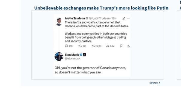 När detta skrivs den första helgen i februari är världen på helspänn efter att Trump på fredagskvällen på månadens sista dag införde handelstullar på varor från Mexiko, Kanada och Kina. Det är omöjligt att förutse vad hans nästa steg är, men han har just nu startat ett handelskrig mellan USA och Kanada. En känslosam Justin Trudeau (Kanadas premiärminister) talade inför sin nation samtidigt som de slog tillbaka och implementerade tullar på amerikanska varor.