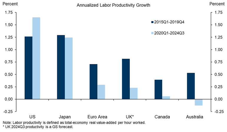 Amerikaner har anledning att vara optimistiska. Studera nedanstående bild som visar produktivitetstillväxten i olika länder och regioner. Det är framför allt de senaste fem åren som USA kört ifrån resten av världen i effektivitet.