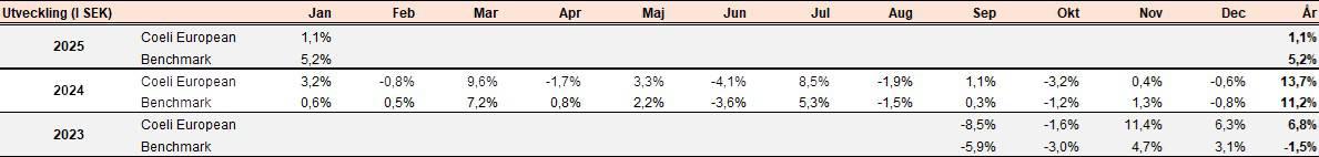 Fondens värde ökade med 1,1 procent i januari (andelsklass I SEK), samtidigt som jämförelseindex ökade med 5,2 procent. Sedan fondens strategiomläggning i september 2023 har värdet ökat med 22,7 procent, att jämföra med en ökning om 15,2 procent för jämförelseindex.