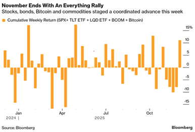 Precis som i oktober uppvisade november ett motsatt mönster jämfört med historiken. En befarad utebliven amerikansk räntesänkning i december i kombination med att investerare började ifrågasätta framtida vinster och värderingar för AI-bolagen, skapade ett stort tryck nedåt på världens aktiemarknader under månadens första tre veckor. Nasdaq sjönk som mest med 8 procent under månaden jämfört med breda Europaindexet -3 procent. Sista veckan kom rekylen som bjöd på betydande uppgångar för de flesta tillgångsklasserna, se bild nedan.