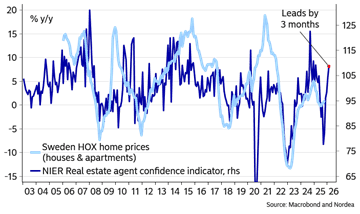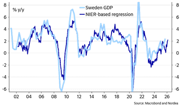 Om Sverige är en föråkare till ett ekonomiskt uppsving i Europa har vi anledning att vara optimistiska. BNP-tillväxten för det tredje kvartalet var bättre än förväntat med 2,6 procent och optimismen börja sprida sig med sjunkande räntor, lägre skatter, en inflation under kontroll och stigande löner. Nordeas sammanvägda BNP-indikator fortsätter att stiga. Positivt!