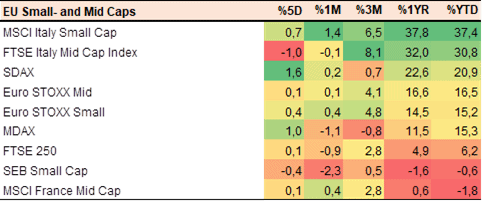 När månaden var slut hade SXXP600 stigit 0,8 procent, MSCI European SMID var oförändrad, S&P500 0,1 procent och Nasdaq -1,6 procent, allt mätt i lokal valuta. Fonden steg 0,2 procent vilket var 0,1 procent bättre än referensindex. Överlägset bästa bidragsgivare var italienska De’Longhi och franska Trigano som steg med 16 respektive 19 procent efter starka rapporter. Svagast bidragsgivare var danska FLSmidth och Bonesupport.