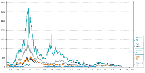För 10–15 år sedan myntades det sällsynt oförskämda epitet ”PIGS” om Portugal, Italien, Grekland och Spanien. Samtliga var i händerna på långivare och fick betala med höga spreadar mot tyska 10årsräntan till följd av sina usla statsfinanser. Utvecklingen sedan dess för ovan nämnda länder har varit synnerligen god, se bild nedan.