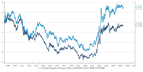 Det motsatta gäller länder som Frankrike och Storbritannien där utmaningarna just nu är betydande. Här hade vi ett nytt epitet på lager, men vår självbevarelsedrift och compliance-avdelning avrådde oss starkt från att nämna det. Dessutom är vi stora vänner till Frankrike och Storbritannien! Nedan Storbritanniens spread mot tyska 10-årsräntan.