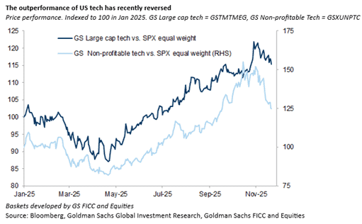 Löpsedlarna svämmar över om hur man skyddar sina pengar mot AI-frossan, vilket brukar vara en utmärkt kontraindikator. Bilden nedan visar hur amerikanska techaktier utvecklats svagare än den breda marknaden den senaste tiden. Mätt över hela året är techaktier dock tydliga vinnare.