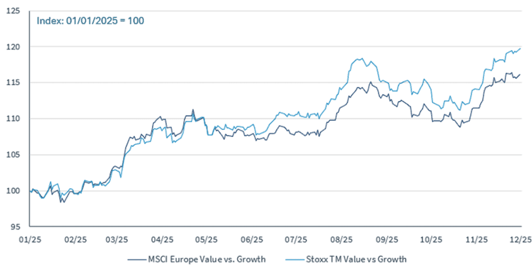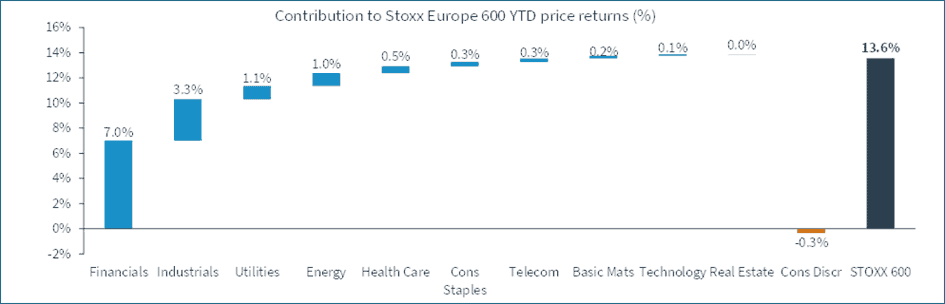 I motsats till USA har värdeaktier utvecklats betydligt starkare än tillväxtaktier i Europa med bank som solklar sektorvinnare.