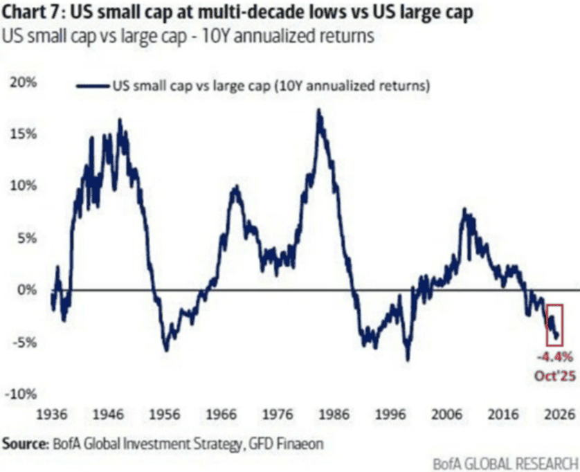 Avkastningen för amerikanska småbolag jämfört med stora bolag är på den lägsta nivån på flera årtionden, se bild nedan med data från 1936.
