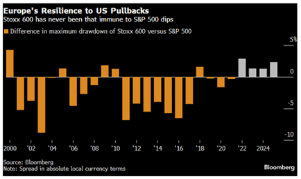 Den gamla sanningen att Europabörserna sjunker mer än de amerikanska motsvarigheterna när det blir turbulent stämmer inte längre. Se bild nedan som visar utvecklingen de senaste 25 åren. Vi gissar att det sannolikt är den extrema koncentrationen i USA med högt värderade techbolag som är orsaken till detta.
