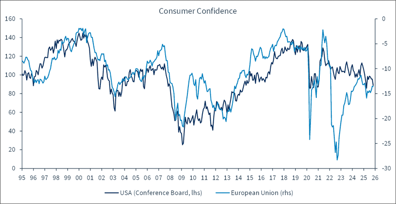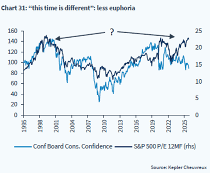 Det var klackarna i taket runt millenniumskiftet och värderingen på S&P500 var på en högstanivå. Efter 25 år har vi nu nått samma nivåer. En stor skillnad jämfört med för 25 år sedan är att det inte är klackarna i taket då konsumentförtroendet är på låga nivåer. Aktiemarknad och realekonomi är inte densamma.
