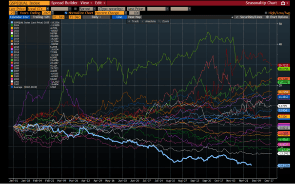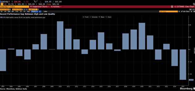 En väldigt tydlig trend i år är kvalitetsbolags svaga kursutveckling jämfört med bolag som har lägre kvalitet (cyklisk, lägre ROCE och vinsttillväxt). Goldman Sachs har en korg av europeiska kvalitetsaktier och mätt sedan 2002 har den aldrig tidigare utvecklats så svagt relativt bolag av låg kvalitet. Innevarande år är den ljusblå linjen längst ned i bilden.