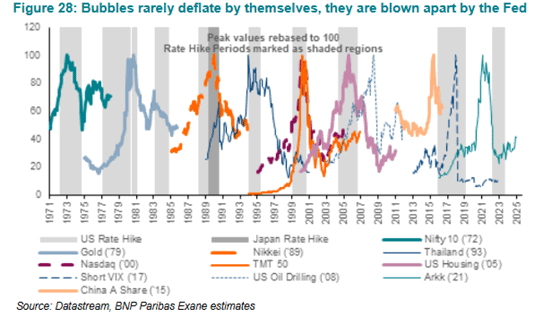 Om vi befinner oss i en AI-bubbla eller inte låter vi vara osagt. Det som däremot är mer säkert är att det är sällan bubblorna själva som skapar en nedgång i marknaden utan det är oftast den amerikanska centralbanken, se bild nedan.