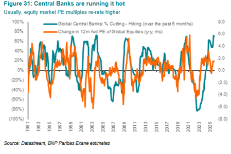 Det fina är att vi nu med hög sannolikhet har Fed med oss nästa år med flera räntesänkningar och det gäller för övrigt majoriteten av världens centralbanker. 80 procent av dem är igång med att sänka styrräntorna vilket bådar gott för efterfrågan på mer riskabla tillgångar som aktier.