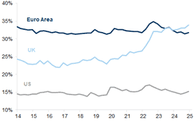 35 procent av förmögenheten hos befolkningen i euroområdet och Storbritannien finns på trötta bankkonton jämfört med cirka 15 procent i USA. Skillnaden i aktiekultur är nog ännu större. Amerikanska privatinvesterare har nu en rekordhög allokering till aktiemarknaden, har högre belåning än tidigare och vi noterar också att intresset för ETF’er med belåning nu är på en rekordnivå. Det kanske blir för mycket?