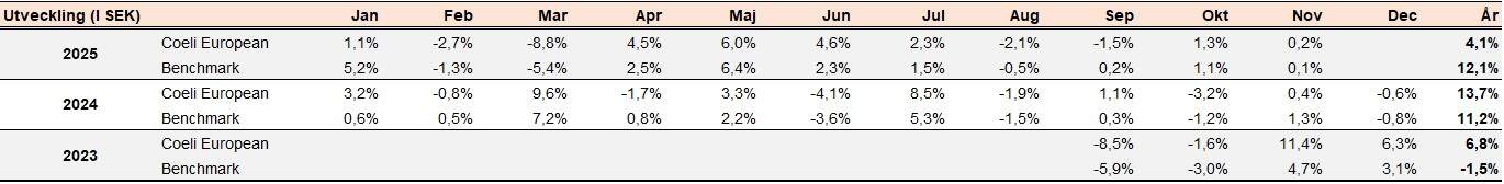 Fondens värde ökade med 0,2 procent i november (andelsklass I SEK), samtidigt som jämförelseindex ökade med 0,1 procent. Sedan fondens strategiomläggning i september 2023 har värdet ökat med 26,4 procent, att jämföra med en ökning om 22,7 procent för jämförelseindex.