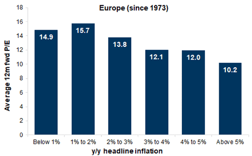 En sjunkande inflation leder till högre värderingar. Bilden nedan visar det historiska P/E-talet i Europa vid olika inflationsmiljöer.