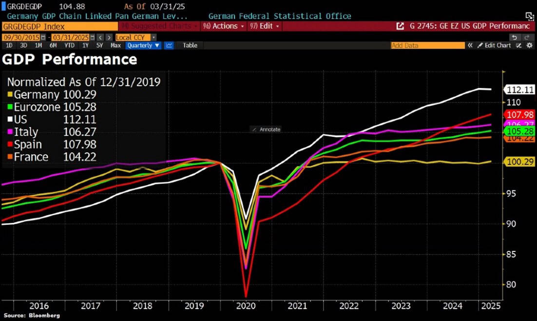 Tyskland, Europas motor, har haft nolltillväxt i flera år. Se bild nedan där USA tydligt leder utvecklingen, till viss del dopat av stora budgetunderskott år efter år.