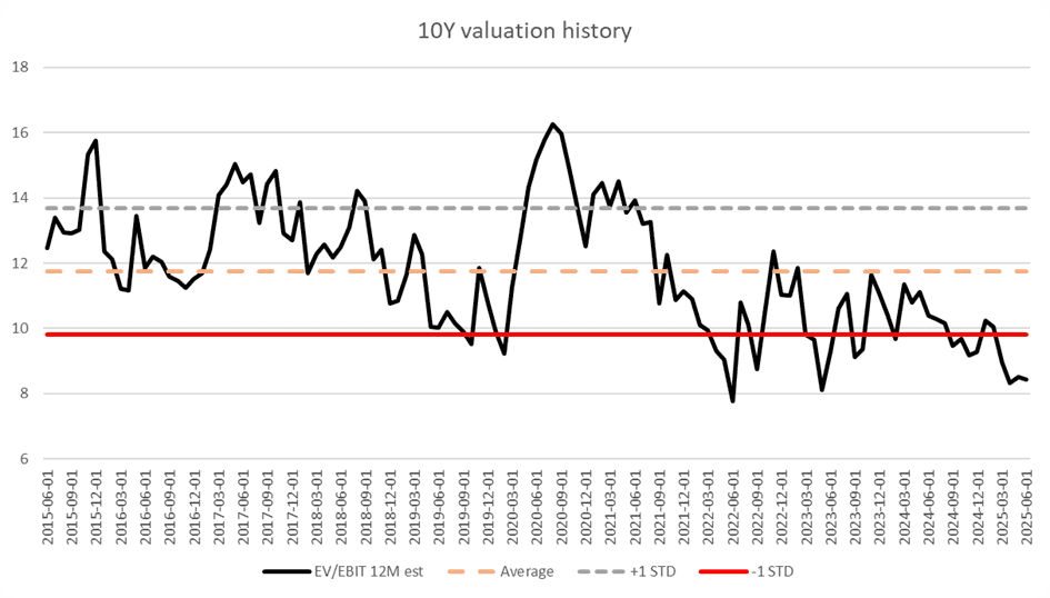Rotork-positionen har inte varit någon särskilt positiv bidragsgivare i år – kursuppgången per den sista maj var omkring 0 procent för 2025 efter en uppgång om 3,5 procent för månaden isolerat. Vi hoppas och tror på att Rotork kan överraska på uppsidan när det är dags för bolagets halvårsrapport. Aktien värderas till cirka 13x EBIT på de nästkommande 12 månadernas analytikerestimat, att jämföra med snittet de senaste tio åren om 16-17x.