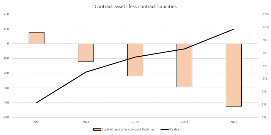 Man ska alltid vara försiktig med kontraktsbaserade affärsmodeller. Särskilt i fall som Babcock, där kontrakten ofta skrivs över många år och där överoptimistiska antaganden kan leda till mycket negativa konsekvenser över lång tid. Den kontraktbaserade modellen ger också att vinsterna avräknas baserat på interna budgetprognoser som lämnar mycket frihet för ledningens antaganden. För oss har det därför varit viktigt att känna oss trygga med bolagets redovisning. Vi noterar att kontraktsskulderna (fall där Babcock erhållit ersättning men ännu inte redovisat dessa ersättningar i resultaträkningen) växt som andel av försäljningen – det ser vi som positivt och kan innebära att den nya ledningen är mer konservativ än tidigare.