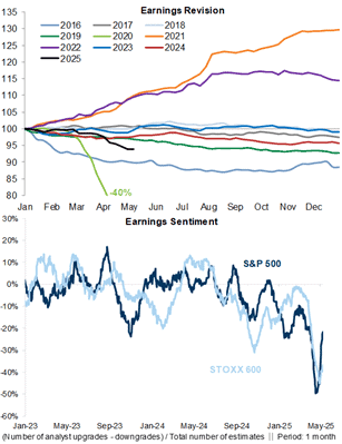 Rapportsäsongen är nu i sin helhet avklarad och svart linje nedan visar årets utveckling så här långt med vinstförväntningar som har kommit ned. Den nedersta bilden visar antal uppjusteringar minus nedjusteringar. USA har återhämtat sig snabbare och vi tror det beror på en ovanligt stark rapportsäsong för Mag7.