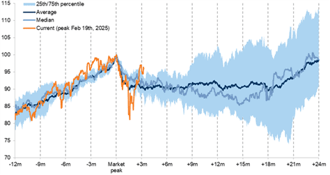 Bilden nedan visar den historiska utvecklingen efter att marknaden nått sin högstanivå, samt årets utveckling som illustreras i den orange linjen.