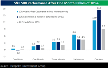 Bilden nedan visar historiskt utveckling efter att S&P500 stigit med 10 procent.