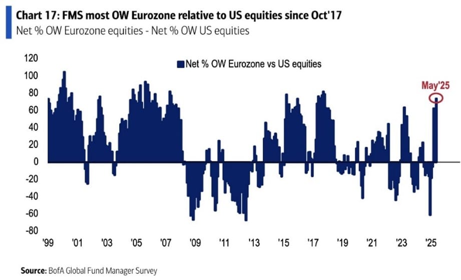 8 av de 10 bästa aktiemarknaderna i världen så här långt i år är europeiska. Europeiska aktier anses vara säkrare investeringar just nu givet all osäkerhet som finns i USA och samtidigt förväntas tillväxten ta fart i Europa. Om det är den politiska osäkerheten som driver skiftet till Europa lär det pågå i flera år till.