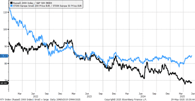 Mätt under samma tidsperiod, amerikanska småbolag i förhållande till större bolag (svart) och europeiska småbolag i förhållande till större bolag (blå). Europeiska småbolag har utvecklats betydligt bättre än de amerikanska och det beror sannolikt på betydande räntesänkningar i Europa, betydligt lägre värderingar och en lägre positionering.