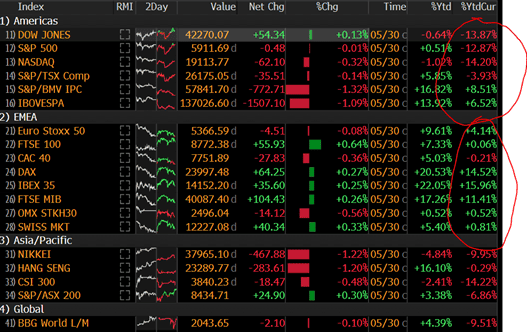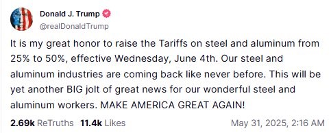 Kaoset med Trumps tariffer fortsatte även om marknaden behöll lugnet betydligt bättre än i april. Fredagen den 23 maj fick världen helt plötsligt höra att USA skulle införa 50 procentiga tullar mot EU redan den 1 juni. På söndagen, efter att ha pratat med Ursula von der Leyen, ändrade Trump sig och flyttade fram tidpunkten till den 9 juli. Fredagen den 30 maj annonserade Trump att han per den 4 juni ska fördubbla tullarna på importerat stål från 25 till 50 procent. Cirkusen fortsätter och det är extremt oseriöst ur alla aspekter. Det är ofattbart att man kan kommunicera och föra en så dålig politik. Det blir intressant att följa utvecklingen när amerikanska företag och konsumenter lite längre fram, garanterat, kommer få betala för den förda politiken. USA kommer successivt bli svagare. med den förda politiken. Kina och Ryssland jublar.