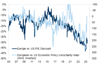 En viss minskning av värderingsrabatten har skett i år mellan europeiska och amerikanska aktier. En förklaring är sannolikt att det ekonomiska osäkerhetsindexet stigit kraftigt i USA.