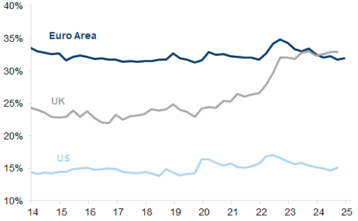Européer föredrar kontanter framför en mer riskfylld tillgångsallokering, vilket framgår tydligt av bilden nedan som visar sedlar och insättningar som andel av hushållens finansiella tillgångar (%).