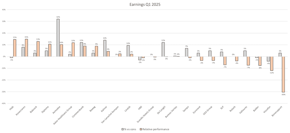 Bilden nedan visar utfall respektive marknadens förväntningar för våra bolag under den nyss avslutade rapportsäsongen. Det är ingen exakt vetenskap såtillvida att det för vissa bolag är resultatet vi fokuserar på medan för andra kan vara omsättningen (det vi bedömer marknaden är mest intresserat av). Den andra kommentaren är att för vissa bolag har det nu gått 1,5 månad sedan rapporteringen medan det för andra gått två veckor. Men med det sagt kan vi konstatera att 20 av 25 bolag uppnått eller överskridit marknadens förväntningar.