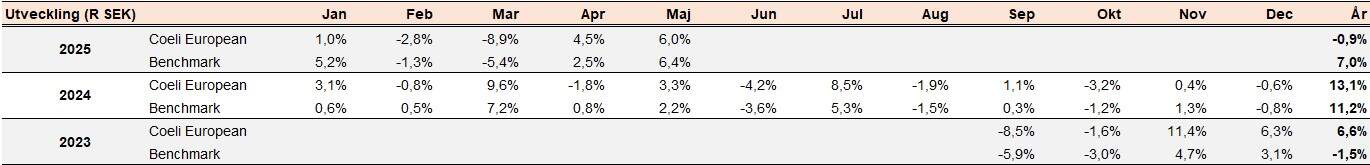 Fondens värde ökade med 6,0 procent i maj (andelsklass R SEK), samtidigt som jämförelseindex ökade med 6,4 procent. Sedan fondens strategiomläggning i september 2023 har värdet ökat med 19,5 procent, att jämföra med en ökning om 17,2 procent för jämförelseindex.
