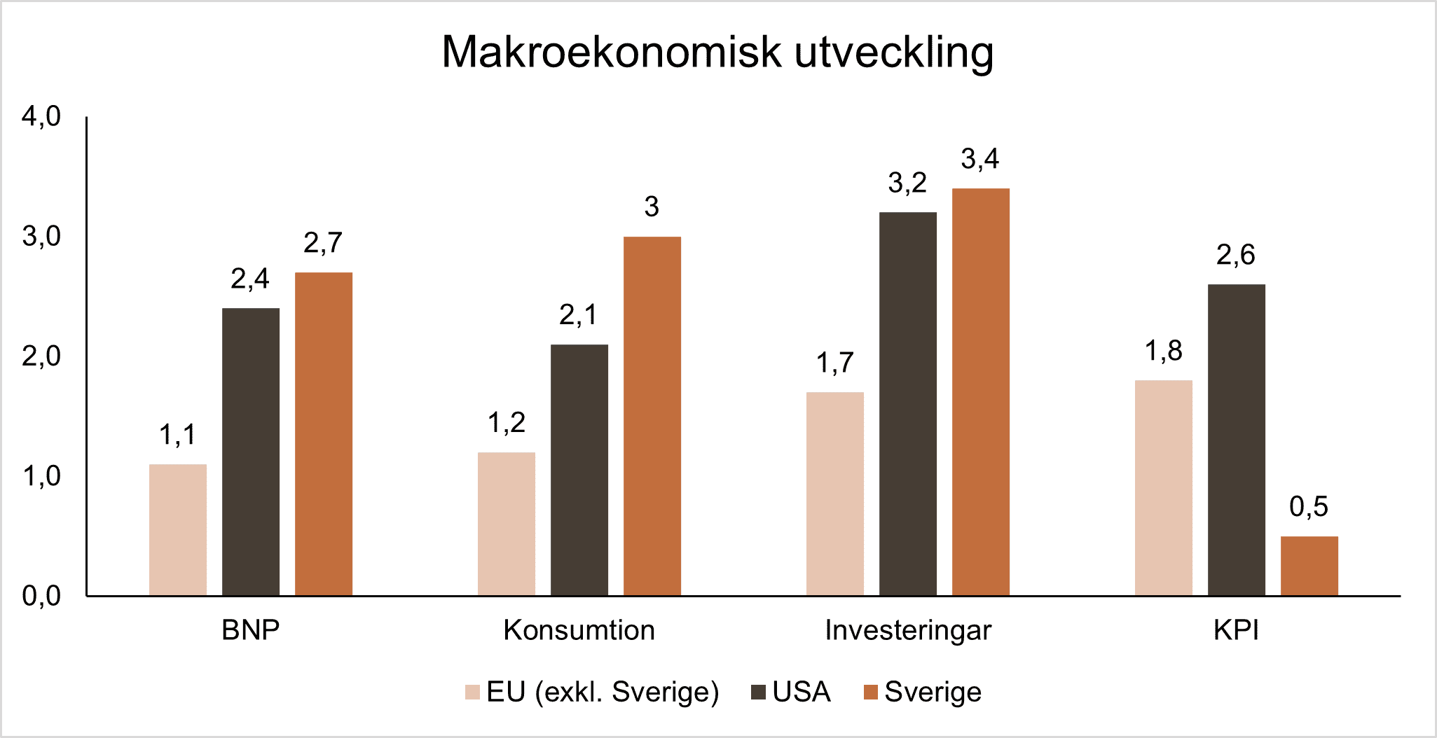 Studier visar att BNP- och sysselsättningsutveckling historiskt är den viktigaste faktorn för totalavkastningen från fastigheter. På den punkten ser läget lovande ut eftersom svensk ekonomi utvecklas väl med tillväxt i BNP, konsumtion och investeringar som tydligt överstiger talen från USA och övriga Europa.